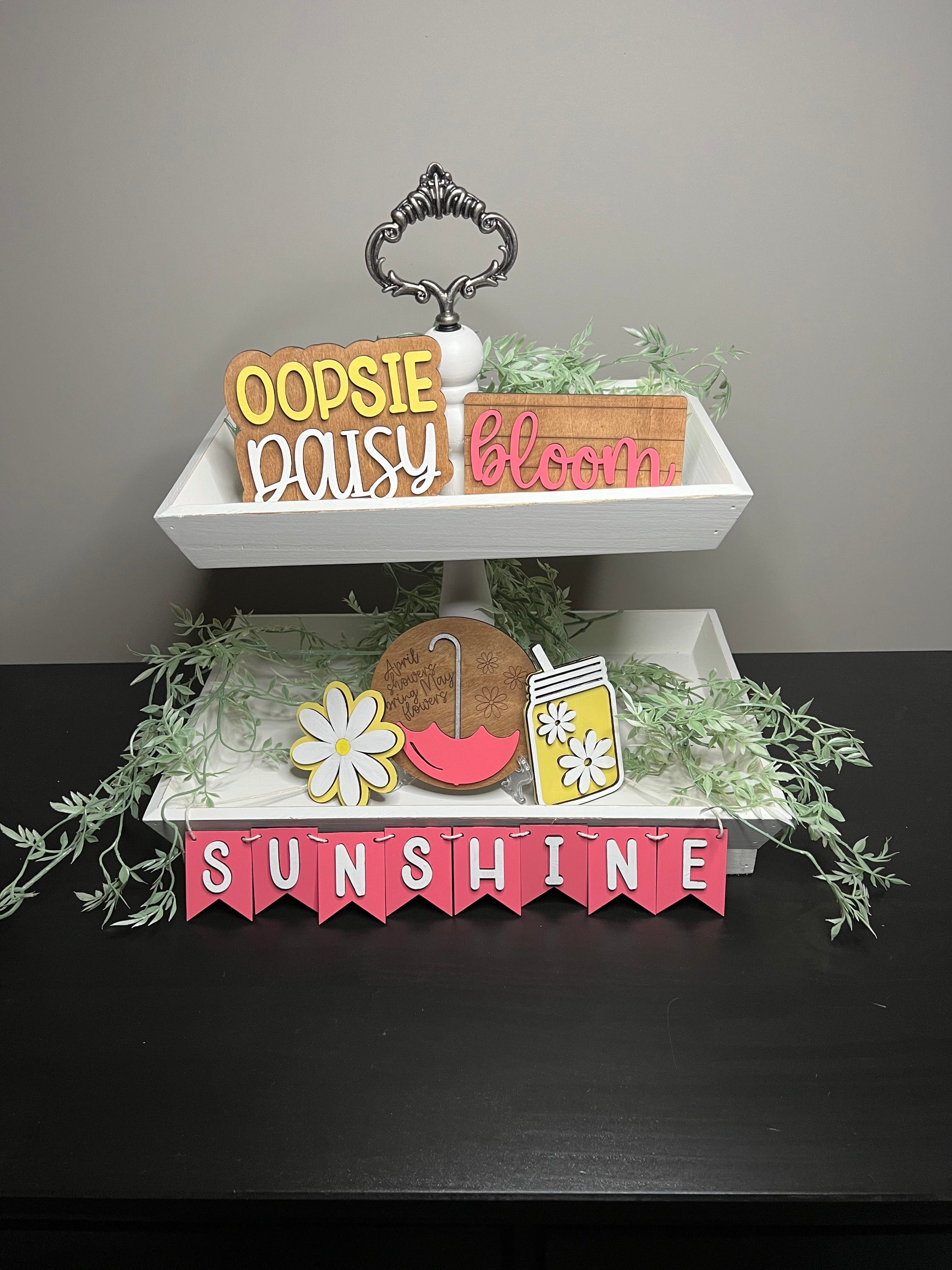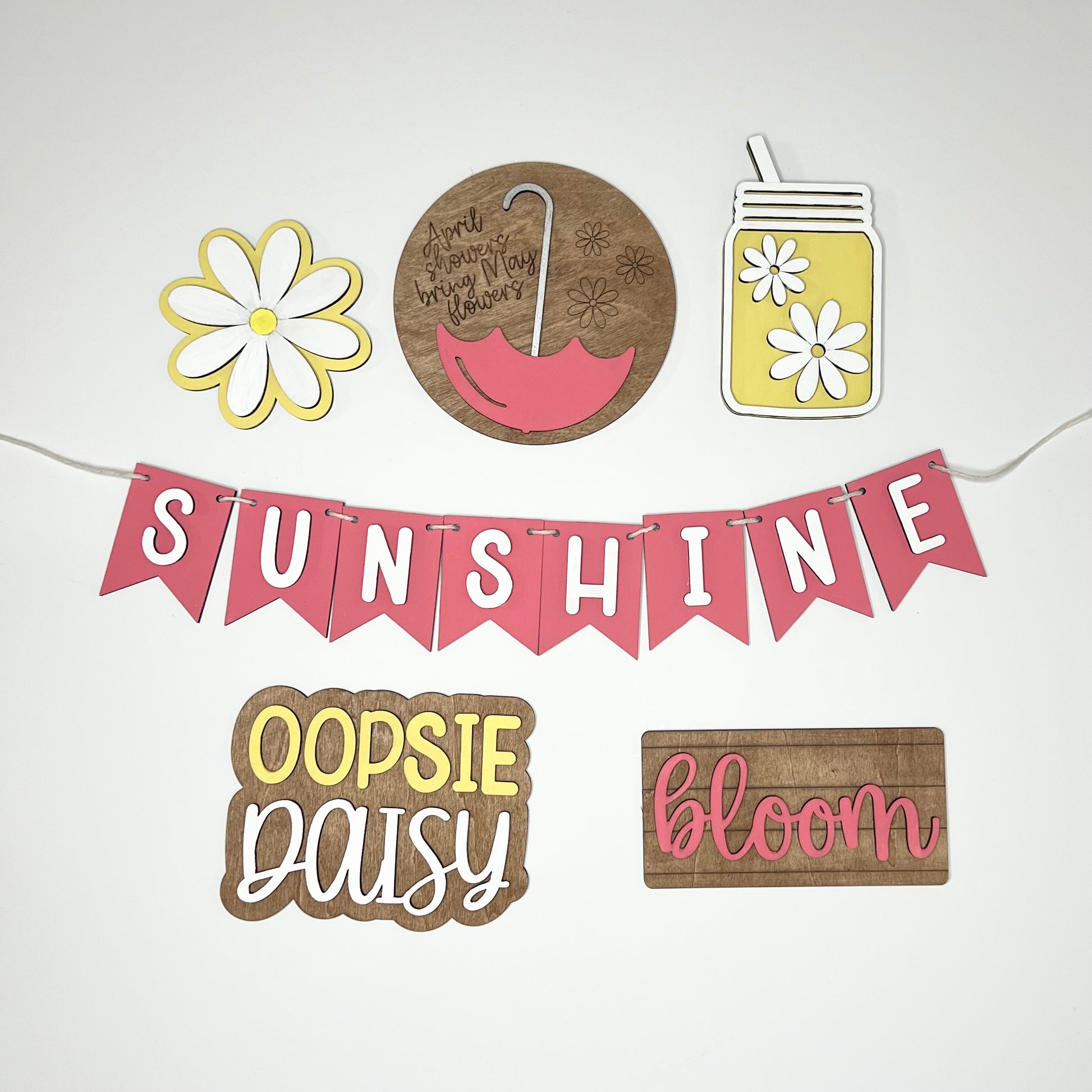 Introducing our Spring Tiered Tray Decor Pack, curated to bring the vibrant spirit of spring into your home. This delightful pack includes six hand-painted wooden cutouts, each meticulously crafted to add a touch of seasonal charm to your tiered tray decor. Featuring a daisy, an April showers bring May flowers umbrella circle, a whimsical water bottle with daisies inside, the playful phrase "Oopsie Daisy," a sunshine banner, and a miniature sign that simply says "Bloom," this pack offers endless possibilities for creating a cheerful springtime display.